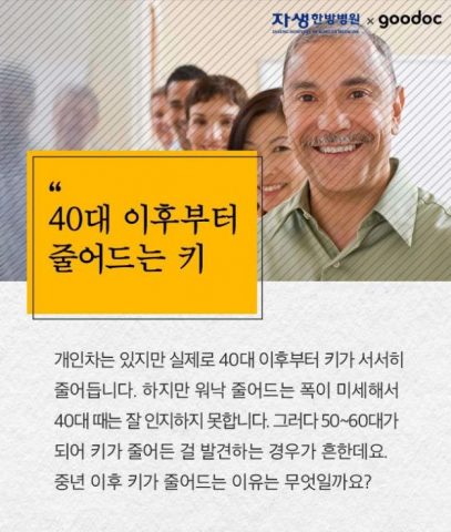 세상에는 키에 대해서 고민이 있는 사람들이 굉장히 많은데, 나이가 들수록 키가 더 작아지는 경우를 많이 보셨을겁니다. 물론 키에 대해 별로 고민이 없는 사람도 많겠지만, 원래 키가 작았던 사람들이 나이가 들면서 더 작아지는것은 정말 큰 고민 중 하나인데요.