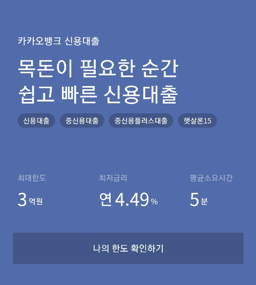 카카오뱅크 앱을 다운받으시면 목돈이 필요한 순간 쉽고 빠르게 카카오뱅크 신용대출이 가능하며 [최대한도 3억원] [최저금리 연 4.49%] [평균 소요시간 5분] 이면 나의 한도를 확인할 수 있습니다.