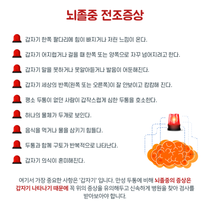 뇌졸중이 와도 10명 중 4명은 뇌졸중의 증상을 인지하지 못하고 지나갔다고 하는데 뇌졸중의 증상이 왔다고 판단되면 병원에 가면 더 이상 악화되는 것을 막을 수 있습니다. 그렇다면 지금부터 뇌졸중 전조증상 11가지 및 예방법에 대한 내용을 상세히 알아보겠습니다.