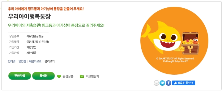 - 상품특징 : 계좌 안의 계좌 [저금통]으로 특별우대이율 및 무료 유아교육서비스를 제공하는 어린이 고객 맞춤 입출금이 자유로운 예금