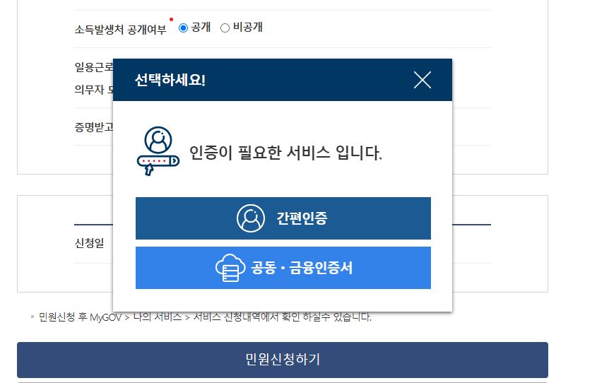6) 제가 비회원 로그인을 하였기 때문에 5번까지 하시고 [민원신청하기]를 누르시면 [간편인증] [공동.금융인증서] 인증 중 택1을 하셔야 합니다.