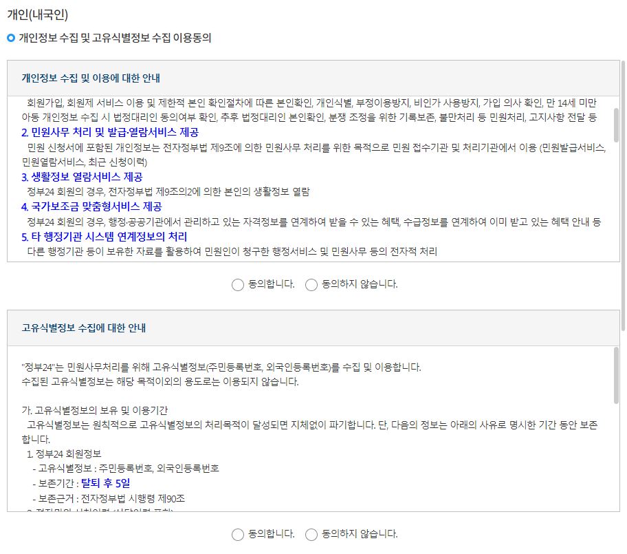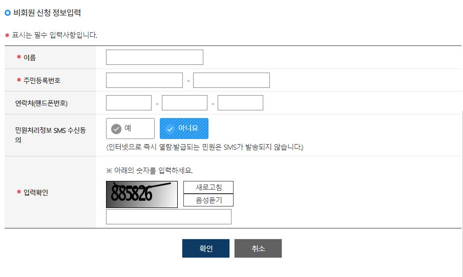 4) 비회원신청을 클릭하시게 되면 우선 개인정보에 동의를 하신 후 [이름] [주민등록번호] [연락처] [민원처리정보 SMS 수신동의] [입력확인]을 기입하시고 [확인]을 누릅니다.