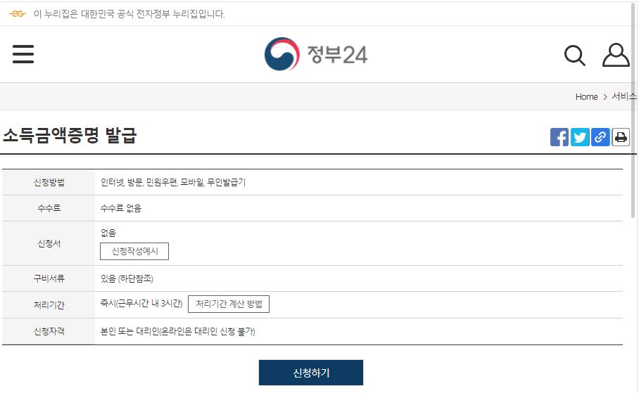 인터넷으로 소득금액증명원 무료 발급(정부24)