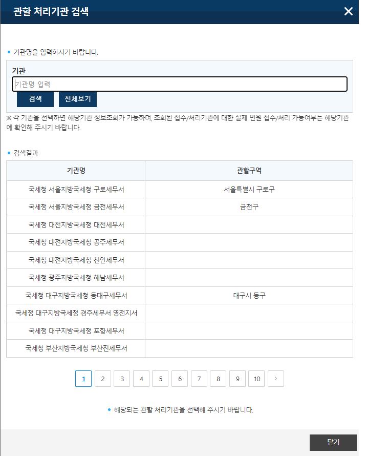 위 링크로 들어가시게 되면 [세무서]를 누르셔서 세무서를 확인하실 수 있습니다.