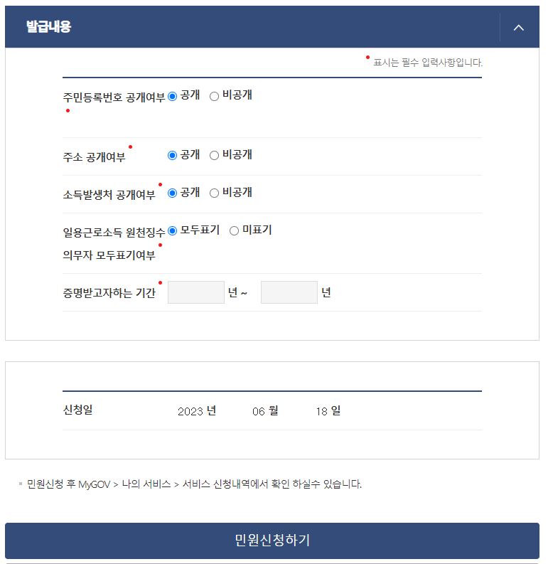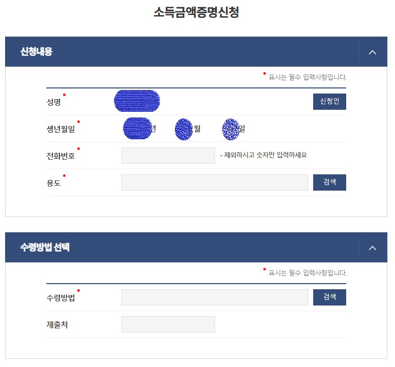 - 내용들 기입하실 때 [수령방법]은 [온라인발급(본인출력)]으로 하시기 바랍니다.