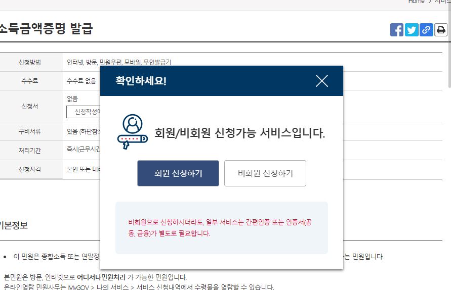 - 비회원으로 신청하시더라도, 일부 서비스는 간편인증 또는 인증서(공동, 금융)가 별도로 필요합니다.