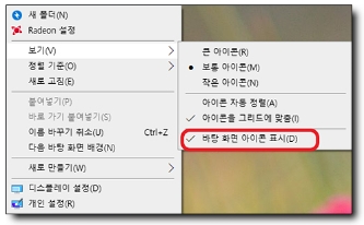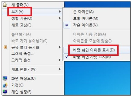 2) 보기를 클릭하시고 -> 바탕 화면 아이콘 표시(D)에 체크해주시면 아이콘이 다시 나타납니다.