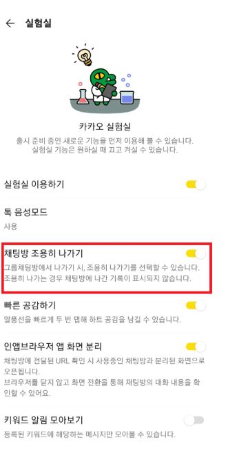 4) 실험실 이용하기가 비활성화 되어 있습니다. [실험실 이용하기]를 활성화 하고 [채팅방 조용히 나가기]도 활성화 합니다.