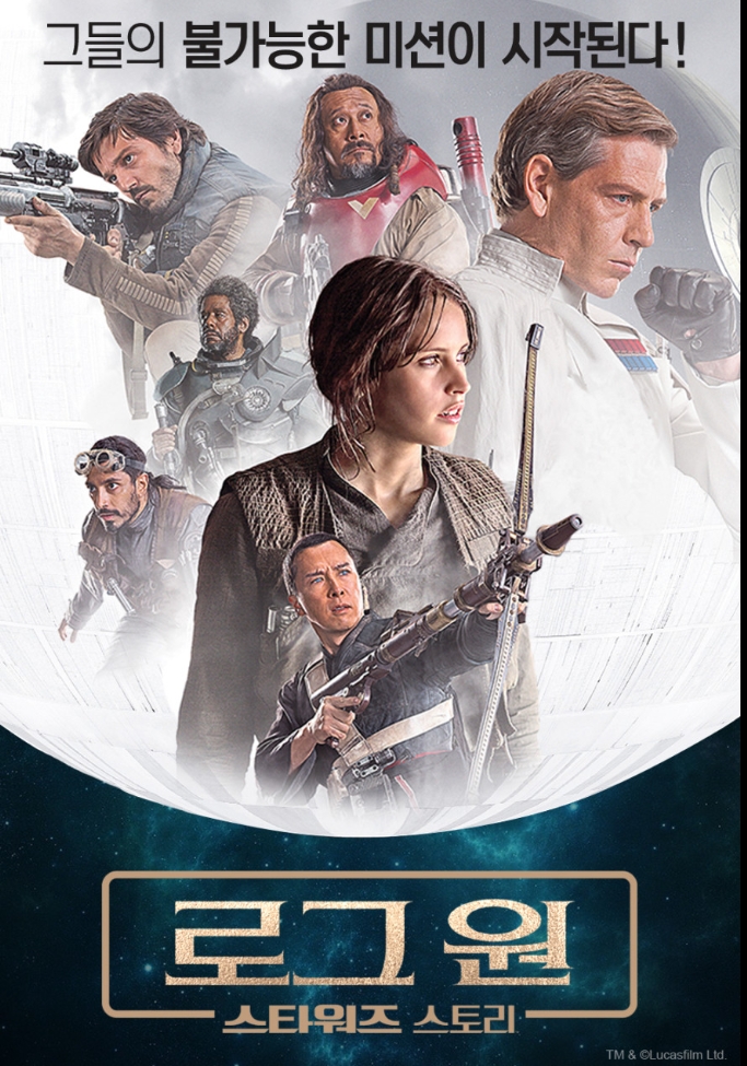 줄거리 : 희망이 사라진 세상. 반군 소속의 ‘진’ (펠리시티 존스)은 적의 최종병기 ‘데스 스타’ 개발에 아버지가 참여했단 과거 때문에 데스 스타의 약점을 캐내는 임무를 떠맡게 된다. 단숨에 행성 하나를 파괴할 위력을 지닌 데스 스타가 완성되기 전에 설계도를 훔쳐내야 하는 이번 작전의 성공 확률은 고작 2.4%. 생사도 모르는 아버지에 얽힌 비밀을 밝히려는 진을 비롯해 유능한 정보 요원 ‘카시안’(디에고 루나), 두 눈이 멀었지만 탁월한 무술 실력을 지닌 ‘치루트’(견자단), 전투 베테랑 ‘베이즈’, 파일럿 ‘보디’, 시니컬한 드로이드 ‘K-2SO’까지 합류, 거대한 전쟁을 끝낼 ‘로그 원’이 이끄는 가장 비밀스런 작전이 시작되는데…