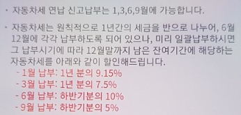 - 1월 자동차세 연납 신청 시 9.15% 공제. 연세액 x 334/365 x 10%