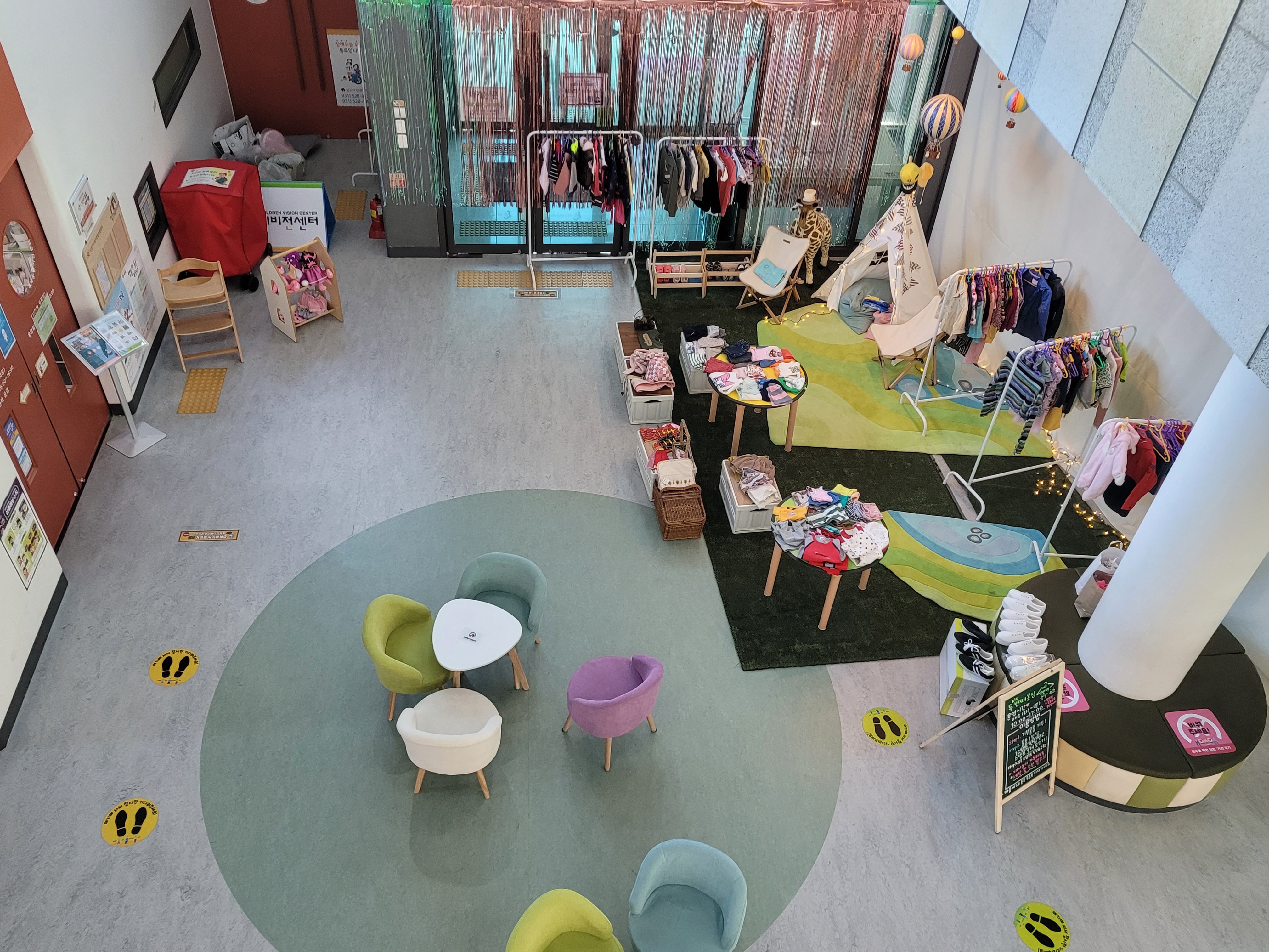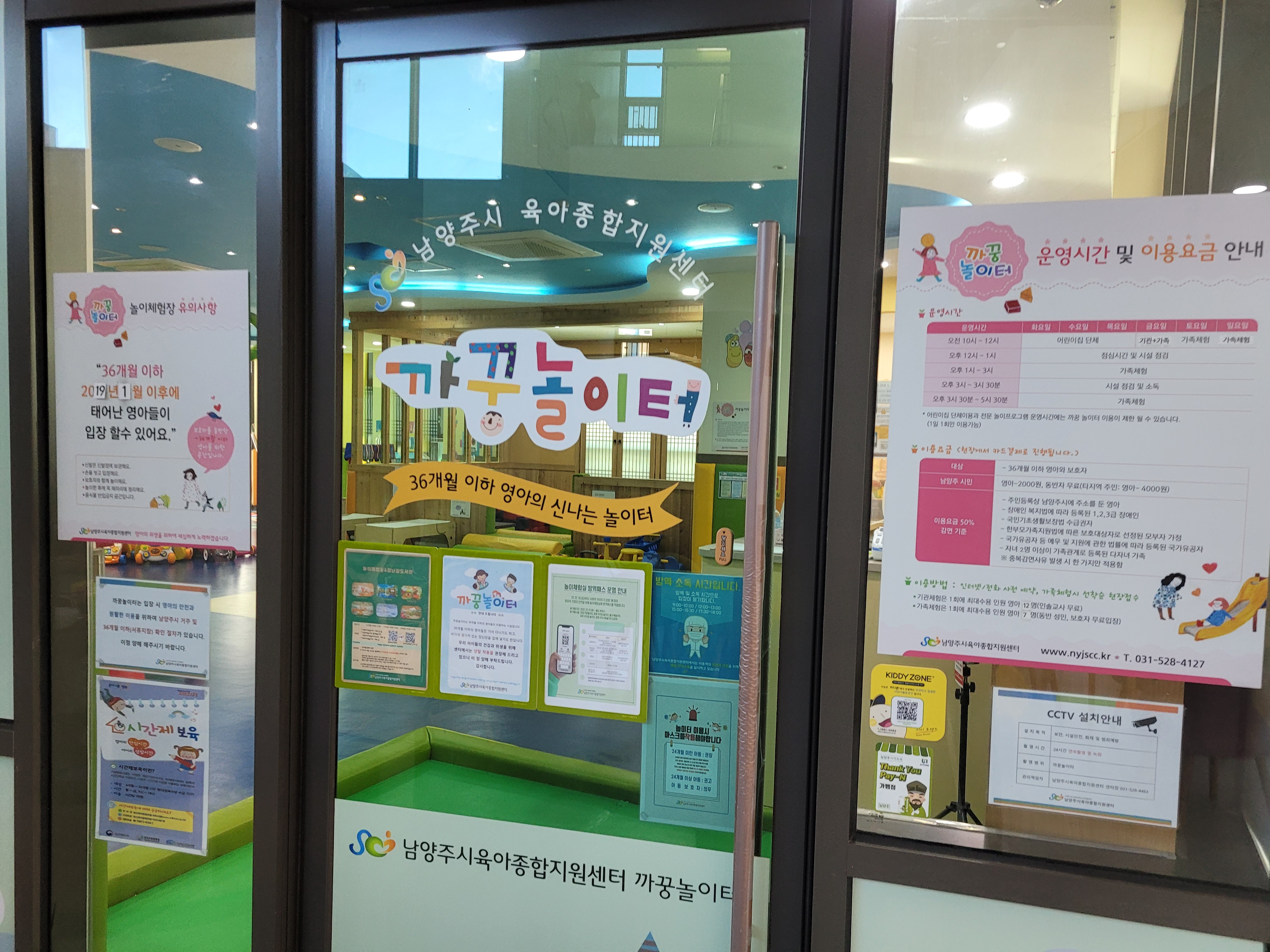 1층은 "장난감도서관" "까꿍놀이터" "카페테리아"가 있습니다. 카페테리아는 미 운영중에 있었으며 까꿍놀이터는 36개월 이하 영아들만 입장할 수 있는 놀이터 입니다. 가격은 남양주 시민은 영아 2,000원 동반자 무료이며 타 지역주민은 영아 4,000원으로 입장하실 수 있습니다.