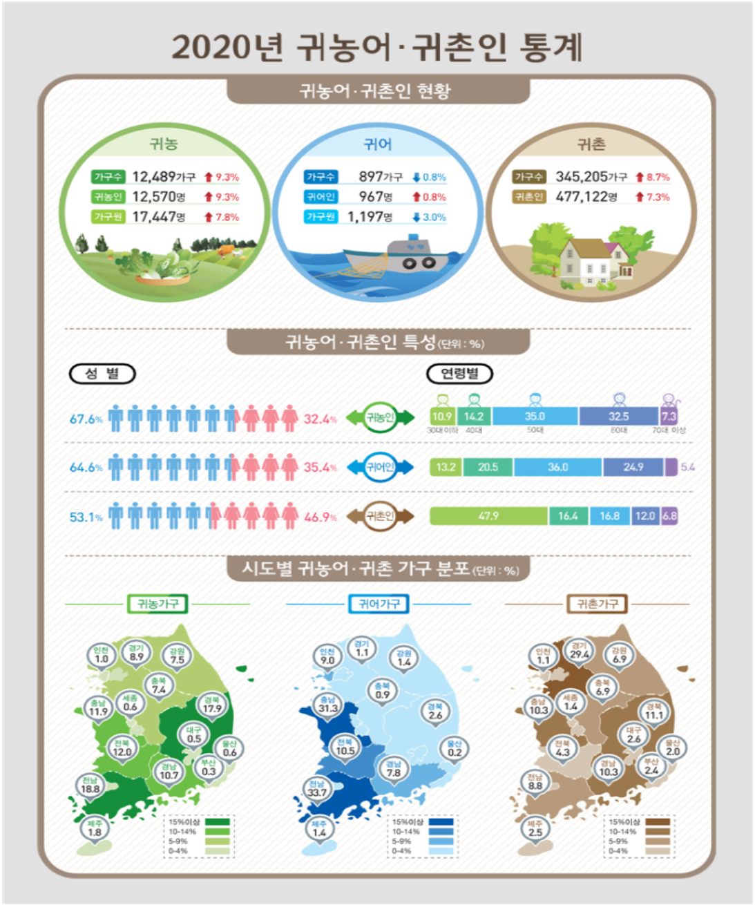귀촌을 하는 분들은 30대가 47.9%로 많았으며 그 이유로는 [농산업분야의 직장취업] [정서적으로 여유로운 생활을 위해] [자연환경이 좋아서] [저렴한 집값 때문에] [가족 및 친지와 가까이 살기 위해] [본인이나 가족의 건강상의 이유] 이런 이유들이 있었습니다.