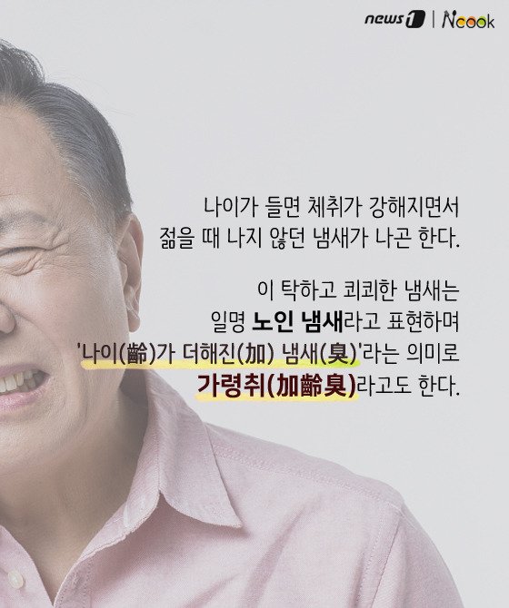 사람의 피부에서 배출되는 각종 대사산물에서 발생하며 피부가 배출하는 대사산물의 종류는 나이에 따라 다르기에 10대,20대,30대에는 냄새가 나지 않고 40대 이후부터 발생하게 됩니다. 특히나 노인분들의 경우에는 불포화지방의 과산화로 인해서 발생하는 하이드록 시노 날이라는 독성물질을 만들어내기 때문에 더 냄새가 독하게 느껴집니다.