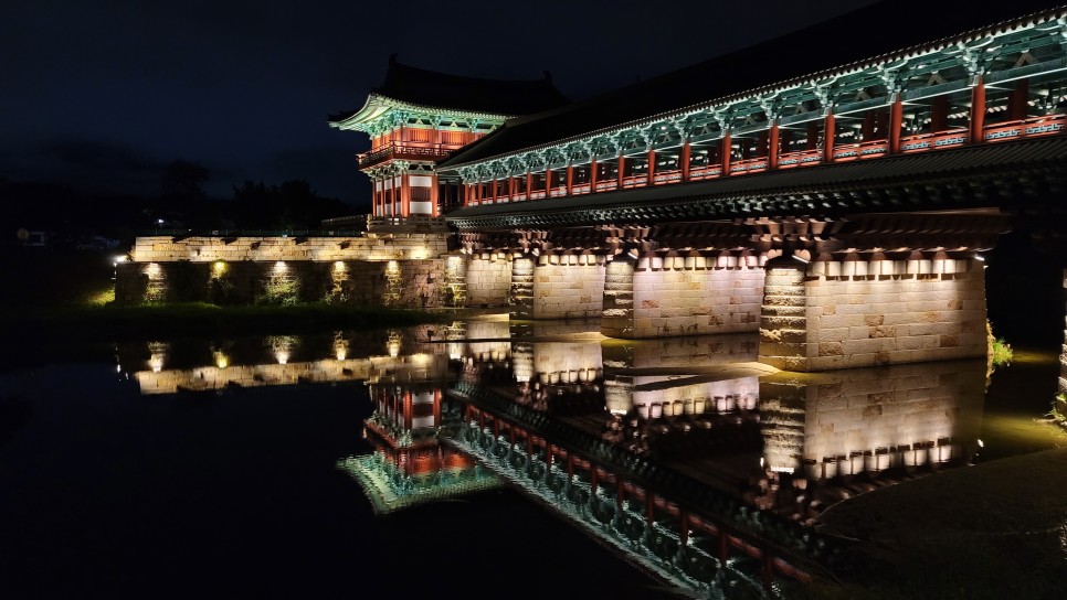 노을이 지면서도 아름답지만 어둠에 휩싸이기 시작하면서 하나둘 켜지는 조명은 동궁과 월지의 분위기를 한층 더 업그레이드 시켜줍니다. 잔잔한 호수에 조명과 달빛이 일렁이면서 한편의 영화를 보여주는 듯 한 모습입니다.
