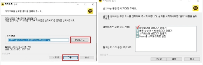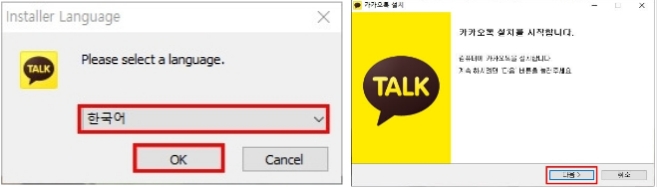 3) 한국어 영어 등 어떤 언어로 설치를 할것인지 뜨는데 [한국어]를 선택하시고 [OK]를 눌러주시고 카카오톡 설치를 시작합니다.