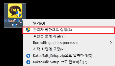 2) 카카오톡 설치파일을 다운로드 한 곳으로 가셔서 마우스 우측으로 클릭 후 [관리자 권한으로 실행]을 눌러서 카카오톡 설치 파일을 시작합니다.