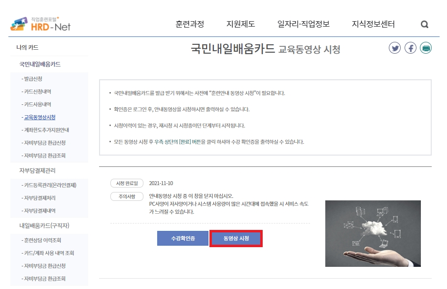 2) 회원가입을 실시 후 국민내일배움카드 [교육 동영상 시청] 합니다.