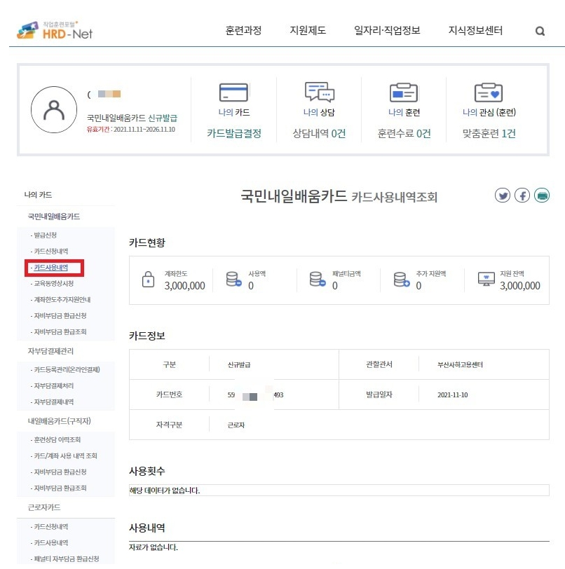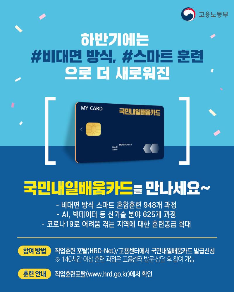 - 유효기간 5년 : 실업, 재직, 자영업 여부 상관없이 5년간 사용이 가능하기 때문에 내가 배우고 싶은 것이 무엇인지 오랫동안 고민해서 교육을 신청해 받을 수 있습니다.