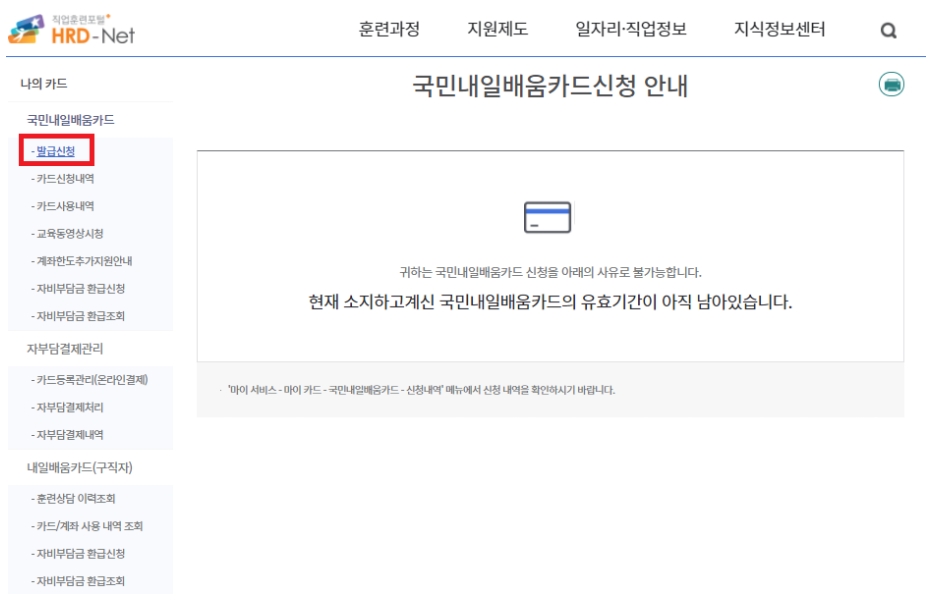 3) 나의 정보를 눌러서 나의 카드 -> 국민내일배움카드 -> 발급신청을 눌러서 작성하고 카드를 신청합니다.