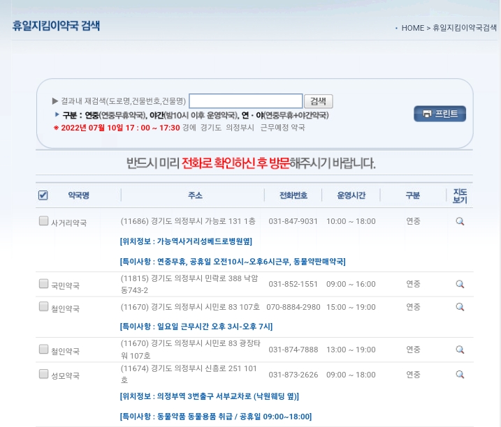 임의로 [경기도 의정부시]를 검색해봤습니다. 제가 처음에 입력했던 7.10일 17시에 영업을 하고 있는 의정부시 약국에 대한 리스트가 나오게 됩니다. 약국이 왜 이거밖에 검색이 안돼지? 하실 수 있는데 그건 제가 방문해야 하는 시간에 영업을 하는 곳이 저곳이 다 이건것입니다.