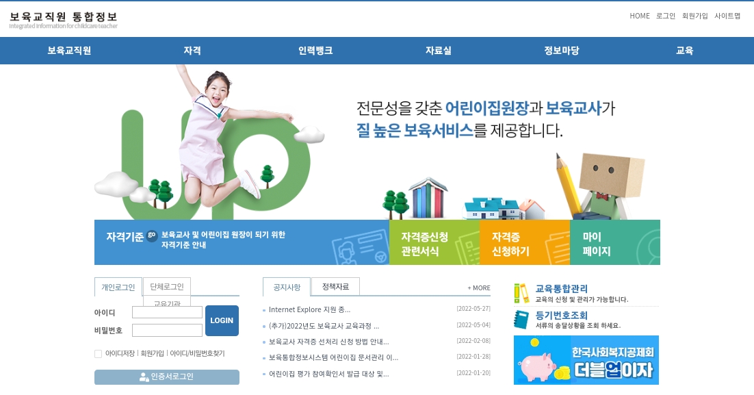 1) 보육교직원 통합정보 사이트에 접속해주세요.(하단에 링크 첨부했습니다.)