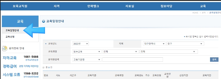 3) 화살표부분 [교육일정안내]에서 일정을 확인할 수 있고 그 아래 교육신청에서 교육신청까지 확인하실 수 있습니다.