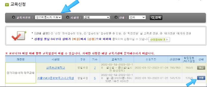 2) 상단에 교육신청을 누르신 후 장기미종사자 교육에 대한 검색을 하시면 마감/신청 표시가 되는데 신청부분에 인원표시/날짜/시설명을 확인하실 수 있습니다. 신청해서 이수하시면 됩니다.
