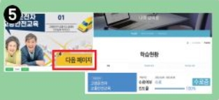 5) 실제 교육 시 다음과 같은 화면이 나오고 학습이 끝나면 [다음페이지] 버튼으로 화면 전환이 가능합니다. 모든 교육이 종료되면 학습현황에서 [수료내역] 확인이 가능합니다.